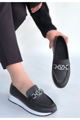 Hante Siyah Beyaz Keten Taşlı Babet Ayakkabı