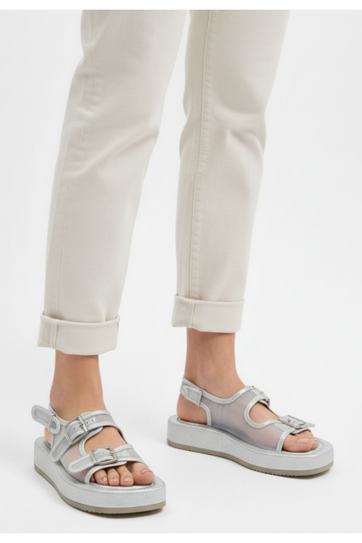 Sinna Gümüş Cilt Tül Detaylı Sandalet