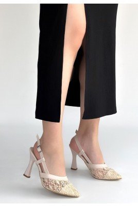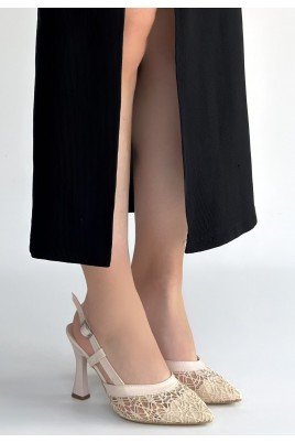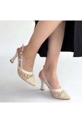 Ceta Bej Cilt Tül Detaylı Topuklu Ayakkabı